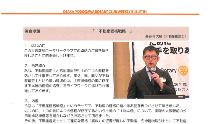 大阪淀川ロータリークラブ例会卓話にて不動産価格戦略」についてお話させていただき、会報にも掲載いただきました。その様子をこちらにもUPしたいと思います。